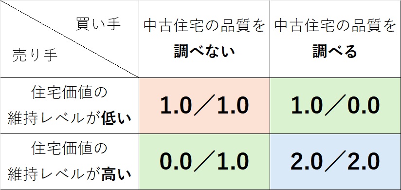 このように、お互いが損をすることを恐れるあまり、結局「何もしない」という左上の選択(質の低い物件が、よく調べられないまま取引される)に落ち着きがちになってしまうのです。