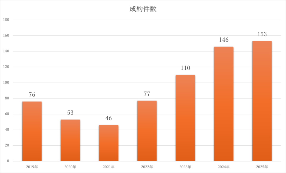 成約件数は増加するも、伸び率は鈍化: 年間で153件(※)の成約があり、過去7年で最多水準となりましたが、昨年の急増に比べると伸び率は4.8%にとどまり、頭打ちの傾向が見え始めています。