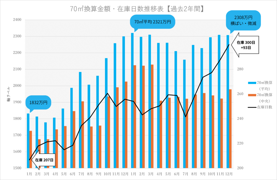 在庫期間が300日を超えて長期化しているにもかかわらず、中央価格(市場のボリュームゾーン)が下がっていません。
