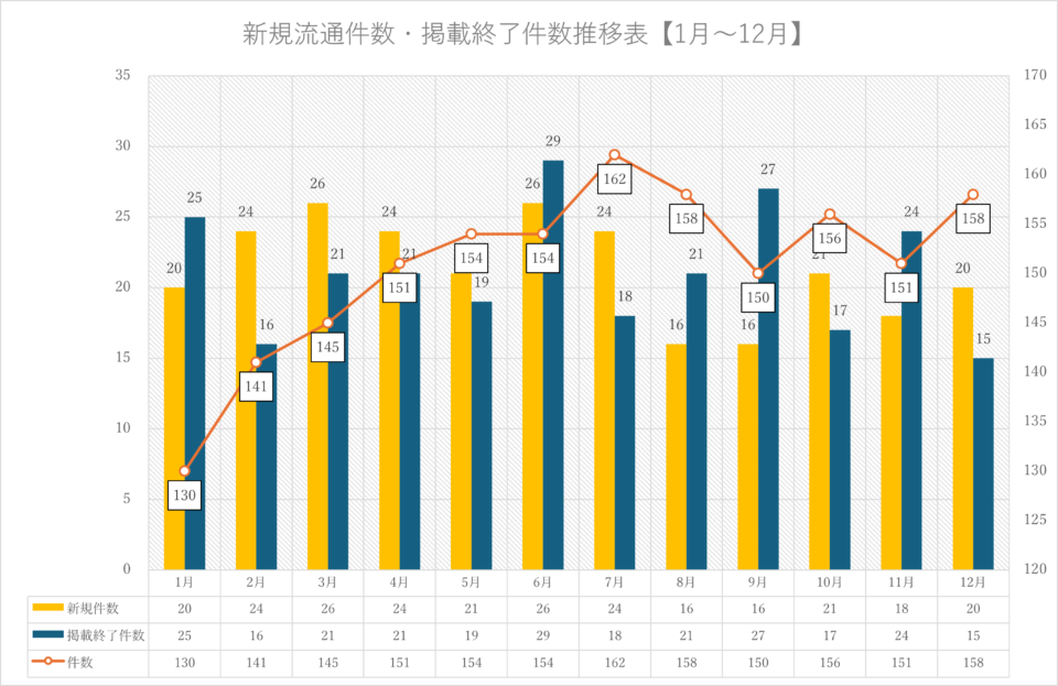 - 2024年:年末にかけて在庫が減少(134件)し、品薄感がありました。