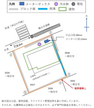 ※ご購入検討の際は、敷地前面の歩道橋や電柱、解体後の敷地と道路の高低差、一部境界標の未設置等の留意事項について、必ず現地および資料にて詳細をご確認ください。