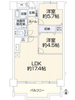 | 面積 | 64.23m²(19.42坪) | バルコニー | 南向き 9.60m² | 間取 | 2LDK | ||