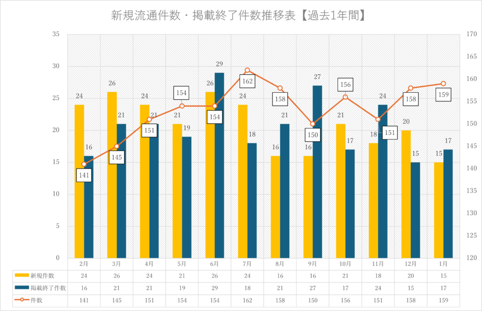 - 流通物件数: 159件(前月比 +1件 📈) ※過去2年間で2番目の高水準